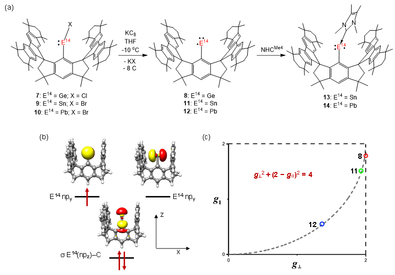 图2. 单取代Ge(I)、Sn(I)与Pb(I)自由基的合成、电子结构及g因子分布。