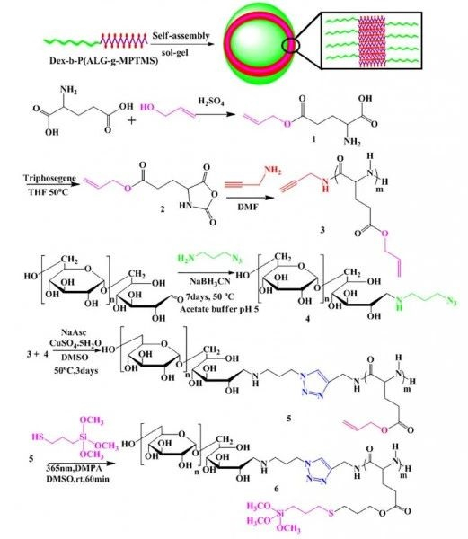 明星色情小说 材料科学与工程学院张黎明教授课题组对含三甲氧基硅烷侧基的两亲性葡聚糖/聚-L-谷氨酸酯嵌段聚合物衍生物的合成、核交联有机/机杂化纳米胶束的制备以及药物释放开展了以下研究工作:首先利用“叠氮-炔基”点击反应合成葡聚糖/聚(γ-丙烯基-L-谷氨酸酯)嵌段聚合物 (Dex-b-PALG),后使用“巯基-乙烯基”点击反应将(3-巯基丙基)三甲氧基硅烷 [(3-Mercaptopropyl)trimethoxysilane (MPTMS)]引入聚(γ-丙烯基-L-谷氨酸酯)链段上制得含三甲氧基硅烷侧基的两亲性葡聚糖/聚-L-谷氨酸酯嵌段聚合物衍生物[Dex-b-P(ALG-g-MPTMS)] (图 1),后经过自组装与水解交联作用,得到核交联的有机/机杂化纳米胶束。用光散射、透射电镜等分析测试手段对该类杂化纳米胶束进行表征;研究了不同的制备条件对所得杂化纳米胶束粒径与形貌的影响,最后通过药物释放实验与体外细胞毒性试验研究了杂化纳米胶束作为药物载体的应用前景。