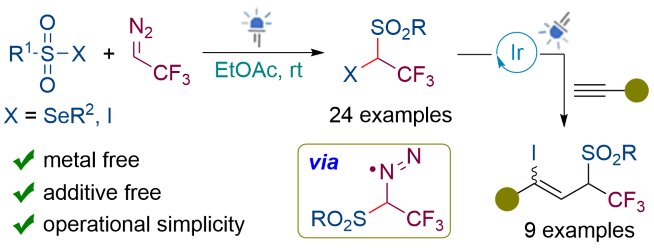 Visible-Light-Promoted Radical gem-Selenosulfonylation or Iodosulfonylation of 2,2,2-Trifluorodiazoethane under Photosensitizer-free Conditions.